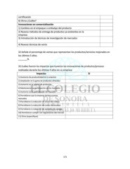 certificación 6) Otros ¿Cuáles? Innovaciones en comercialización 1) Cambios en el empaque o embalaje del producto 2) Nuevos métodos de entrega de productos ya existentes en la empresa 3) Introducción de técnicas de investigación de mercados 4) Nuevas técnicas de venta 32.Señale el porcentaje de ventas que representan los productos/servicios mejorados en los últimos 5 años. _______% 33.Cuáles fueron los impactos que tuvieron las innovaciones de productos/proceso realizadas durante los últimos 5 años en su empresa Impactos Si 1) Aumento de productividad en la empresa 2) Ampliación en la gama de productos ofrecidos 3) Aumento en la calidad de productos 4) Mantuvieron su participación en los mercados 5) Aumento en la participación del mercado 6) Permitieron que la empresa abriera nuevos mercados 7) Permitieron la reducción de costos de trabajo 8) Permitieron la reducción de costos de insumos 9) Permitieron la reducción de consumo de energía 10) Permitieron cumplir con regulaciones del mercad 11) Otros (especifique) 171
