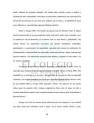 donde millones de personas alrededor del mundo ahora tendrán acceso a medios e información antes impensables, motivando así una intensa competencia que convertirá a la fuerza del conocimiento en una arma más poderosa que la física, y la habilidad de hacer cosas diferentes y especializadas superará al trabaja repetitivo. Subirá y Gurguí (2007, 10) resaltan las aportaciones de Michael Porter al señalar que la competitividad es una preocupación central tanto de los países más avanzados como de aquellos en vías de desarrollo, en un mundo cada vez más abierto y globalizado. Este mundo incluye las capacidades nacionales que aporten certidumbre, estabilidad, participación y conocimiento; las capacidades regionales que formen las condiciones de infraestructura y competitividad; las capacidades locales para formar y atraer empresas que generen empleos; y las capacidades personales para trabajar y competir en otros países y en las mejores compañías. De acuerdo al diccionario Oxford de economía, competitividad se define como “la capacidad para competir en los mercados de bienes y servicio” (Romo y Musik, 2005). Esa capacidad no se sustenta ya en el costo y disponibilidad de la mano de obra, la capacidad instalada o los recursos naturales; hoy en día esa capacidad depende más de factores como los que señalan Subirá y Gurguí (Ibid) siguiendo a Porter: “las empresas de una nación deben pasar de competir sobre ventajas comparativas (bajo costo de mano de obra o recursos naturales)a competir sobre ventajas competitivas que surjan a partir de productos y procesos únicos”. Aunque en el texto los autores hacen referencia solo a las empresas, es una realidad que aplica tanto para individuos como a países. En el mismo sentido, David y Foray 19