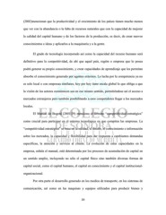 (2002)mencionan que la productividad y el crecimiento de los países tienen mucho menos que ver con la abundancia o la falta de recursos naturales que con la capacidad de mejorar la calidad del capital humano y de los factores de la producción, es decir, de crear nuevos conocimientos e ideas y aplicarlos a la maquinaria y a la gente. El grado de tecnología incorporado así como la capacidad del recurso humano será definitivo para la competitividad, de ahí que aquel país, región o empresa que lo posea podrá generar su propio conocimiento, y crear capacidades de aprendizaje que les permitan absorbe el conocimiento generado por agentes externos. La lucha por la competencia ya no es solo local o con empresas similares; hoy por hoy tiene escala global lo que obliga a que la visión de los actores económicos sea en ese mismo sentido, permitiéndose así el acceso a mercados extranjeros pero también posibilitando a esos competidores llegar a los mercados locales. El Manual de Bogotá (2001:29) menciona el término “competitividad estratégica” como crucial para participar en el entorno tecnológico en que compiten las empresas. La “competitividad estratégica” se basa en la calidad, el diseño, el conocimiento e información sobre los mercados, la capacidad y flexibilidad para dar respuesta a cambiantes demandas específicas, la atención y servicio al cliente. La evolución de estas capacidades en la empresa, señala el manual, está determinada por los procesos de acumulación de capital en un sentido amplio, incluyendo no sólo el capital físico sino también diversas formas de capital social, como el capital humano, el capital en conocimiento y el capital institucional- organizacional. Por otra parte el desarrollo generado en los medios de transporte, en los sistemas de comunicación, así como en las maquinas y equipos utilizados para producir bienes y 20
