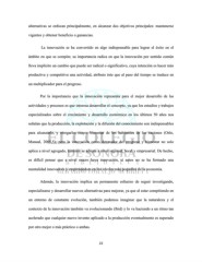 alternativas se enfocan principalmente, en alcanzar dos objetivos principales: mantenerse vigentes y obtener beneficio o ganancias. La innovación se ha convertido en algo indispensable para lograr el éxito en el ámbito en que se compite; su importancia radica en que la innovación por sentido común lleva implícito un cambio que puede ser radical o significativo, cuya intención es hacer más productiva y competitiva una actividad, atributo éste que al paso del tiempo se traduce en un multiplicador para el progreso. Por la importancia que la innovación representa para el mejor desarrollo de las actividades y procesos es que interesa desarrollar el concepto, ya que los estudios y trabajos especializados sobre el crecimiento y desarrollo económico en los últimos 50 años nos señalan que la producción, la explotación y la difusión del conocimiento son indispensables para alcanzarlo, y otorgarles mayor bienestar de los habitantes de las naciones (Oslo, Manual, 2005,5); pero la innovación como detonador del progreso y bienestar no solo aplica a nivel agregado, también se adopta a nivel regional, local y empresarial. De hecho, es difícil pensar que a nivel macro haya innovación, si antes no se ha formado una mentalidad innovadora y emprendedora en los niveles más pequeños de la economía. Además, la innovación implica un permanente esfuerzo de seguir investigando, especializarse y desarrollar nuevos alternativas para mejorar, ya que al estar compitiendo en un entorno de constante evolución, también podemos imaginar que la naturaleza y el contexto de la innovación también va evolucionando (Ibid) y lo va haciendo a un ritmo tan acelerado que cualquier nuevo invento aplicado a la producción eventualmente es superado por otro mejor o más práctico o ambas. 22