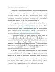 I.2Aproximación conceptual a la innovación La innovación no es necesariamente sinónimo de una tecnología (alta), aunque esta intervenga cada vez más en los equipos, materiales, programas informáticos (tecnología incorporada) y métodos. Una gran parte de las innovaciones resulta de nuevas combinaciones de elementos ya conocidos o de nuevos usos, o de la creatividad en la concepción de los productos. (El Libro Verde de la Innovación, 1995: 9). Por otra parte el conocimiento no es sinónimo de innovación; adquiere esa condición cuando un nuevo saber se aplica comercialmente en un proceso productivo particular. De la misma manera, es importante tomar en cuenta que la innovación tiene distintas modalidades derivadas de su impacto en la producción o en la competitividad. En este sentido podemos decir que hay innovaciones incrementales y radicales. Las innovaciones “radicales” son capaces de generar los grandes cambios del mundo al provocar una transformación total en la elaboración o en la introducción de un producto, un proceso o servicio. Un ejemplo, puede ser el invento del motor en los coches para sustituir a los caballos, así como la llegada de la televisión y el internet. Carlota Pérez (2002) señala que las innovaciones radicales se ubican al centro de las fuerzas básicas que impulsan el crecimiento y el cambio estructural de la economía. Por otra parte, las innovaciones “incrementales” son las que vienen a alimentar de manera continua los procesos de cambio y agregan valor agregado sobe un producto ya existente. En este sentido, las innovaciones “incrementales” ayudan a mejorar la productividad, eficiencia, calidad, seguridad, comodidad o cualquier otro aspecto que se refleje en mejoras en algún producto o servicio que ya existe. Como ejemplo se puede citar el automóvil, al que le agregan bolsas de aire, frenos de disco o luces más vistosas. 26