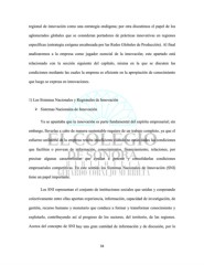 regional de innovación como una estrategia endógena; por otra discutimos el papel de los aglomerados globales que se consideran portadores de prácticas innovativas en regiones específicas (estrategia exógena encabezada por las Redes Globales de Producción). Al final analizaremos a la empresa como jugador esencial de la innovación; este apartado está relacionado con la sección siguiente del capítulo, misma en la que se discuten las condiciones mediante las cuales la empresa es eficiente en la apropiación de conocimiento que luego se expresa en innovaciones. 1) Los Sistemas Nacionales y Regionales de Innovación Sistemas Nacionales de Innovación Ya se apuntaba que la innovación es parte fundamental del espíritu empresarial; sin embargo, llevarlas a cabo de manera sustentable requiere de un trabajo completo, ya que el esfuerzo unilateral de la empresa resulta insuficiente cuando no están dadas las condiciones que faciliten o provean de información, conocimientos, financiamiento, relaciones, por precisar algunas características que ayudan a generar y consolidarlas condiciones empresariales competitivas. En este sentido los Sistemas Nacionales de Innovación (SNI) tiene un papel importante. Los SNI representan el conjunto de instituciones sociales que unidas y cooperando colectivamente entre ellas aportan experiencia, información, capacidad de investigación, de gestión, recurso humano y monetario que conduce a formar y transformar conocimiento y explotarlo, contribuyendo así al progreso de los sectores, del territorio, de las regiones. Acerca del concepto de SNI hay una gran cantidad de información y de discusión, por lo 34