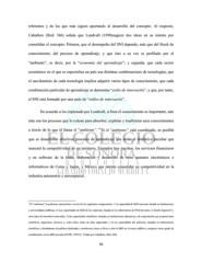 referentes y de los que más siguen aportando al desarrollo del concepto. Al respecto, Caballero (Ibid: 366) señala que Lundvall (1998)sugiere dos ideas en su intento por consolidar el concepto: Primera, que el desempeño del SNI depende, más que del Stock de conocimiento, del proceso de aprendizaje, y que éste a su vez es perfilado por el “ambiente”, es decir, por la “economía del aprendizaje”; y segunda, que cada sector económico en el que se especializa un país usa distintas combinaciones de tecnologías, que el uso/dominio de cada tecnología implica adquirir varios tipos de conocimiento, que cada combinación particular de aprendizaje se denomina “estilo de innovación”, y que, por tanto, el SNI está formado por una serie de “estilos de innovación”. De acuerdo a los expresado por Lundvall, si bien el conocimiento es importante, aún más son los procesos que lo rodean para absorber, explotar y trasformar esos conocimientos 5 a través de lo que él llama el “ambiente”.” Si el “ambiente” está coordinado, es posible que se desarrollen efectivos procesos de aprendizaje que serán el distintivo peculiar que marcará la competitividad de un territorio. Ejemplos hay muchos, los servicios financieros y en software de la India, elaboración y desarrollo de mini aparatos electrónicos e informáticos de Corea y Japón, y México que intenta consolidar su competitividad en la industria automotriz y aeroespacial. 5 El “ambiente” lo podemos caracterizar a través de los siguientes componentes: 1) la capacidad de I&D nacional, basada en instituciones y universidades públicas; 2) Las capacidades de I&D de las empresas, basada en los laboratorios de I%D privados, el diseño ingenieril y otros tipos de knowhow innovador; 3) las capacidades científicas, basadas en instituciones educativas y de capacitación que proporcionen científicos, ingenieros, técnicos y, entre otros, mano de obra capacitada; y 4) las capacidades del gobierno, basadas en instituciones científicas y diseñadoras de políticas dedicadas a monitorear cómo se lleva a cabo la I&D en el sector público y asegurar cierto grado de coordinación con la I&D privada (OCDE, 1992:81. Citado por Caballero, Ibid: 360) 36