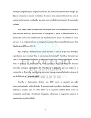 estrategia competitiva y de integración mundial. La producción de bienes hace tiempo que dejo de ser asunto de una sola compañía o de un solo país, para convertirse en una serie de cadenas perfectamente coordinadas que dan como resultado la producción de mercancías globales. Una simple cadena de valor reúne una amplia gama de actividades que se requieren para llevar un producto o servicio desde su concepción, a través de diferentes fases de la producción (incluye una combinación de transformaciones físicas y la entrada de varios servicios en la producción) hasta la entrega al consumidor final y más allá del usuario final (Kaplinsky and Morris, 2001:4). Para Hopkins y Wallerstein una cadena de valor es “una red de procesos de trabajo y producción cuyo resultado final es una mercancía terminada” (Gereffi, y Korzeniewicz, 1994:2). Las definiciones anteriores se refiere solo a una red o cadena simple donde en cada etapa el producto va adquiriendo un valor específico hasta convertirse en producto elaborado, entregado y consumido. Si a lo anterior le agregamos que esas etapas de la producción se desarrollan en diferentes países del mundo, estamos hablando entonces de una Red Global de Producción (RGP). Gereffi, y Korzeniewicz definen una RGP como un conjunto de redes interorganizacionales unidas alrededor de una mercancía o producto, vinculando viviendas, empresas y estados, unas con otras dentro de la economía mundial. Estas redes son socialmente construidas y localmente integradas, subrayando la integración social de la organización económica (Ibid). 42