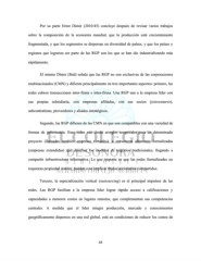 Por su parte Ernst Dieter (2010:45) concluye después de revisar varios trabajos sobre la composición de la economía mundial, que la producción está crecientemente fragmentada, y que los segmentos se dispersan en diversidad de países, y que los países y regiones que lograron ser parte de las RGP son los que se han ido industrializando más rápidamente. El mismo Dieter (Ibid) señala que las RGP no son exclusivas de las corporaciones multinacionales (CMN) y difieren principalmente en tres importantes aspectos: primero, las redes cubren transacciones inter-firma e intra-firma. Una RGP une a la empresa líder con sus propias subsidiaría, con empresas afiliadas, con sus socios (joinventures), subcontratistas, proveedores y aliados estratégicos. Segundo, las RGP difieren de las CMN en que son compatibles con una variedad de formas de gobernanza. Esas redes van desde arreglos temporales para un determinado proyecto (llamadas también empresas virtuales), a estructuras altamente formalizadas (empresas extendidas) que desafían los modelos de negocios tradicionales, llegando a compartir infraestructura informativa. Lo que importa es que las redes formalizadas no requieran propiedad común; pueden o no implicar títulos accionarios compartidos. Tercero, la especialización vertical (outsourcing) es el principal impulsor de las redes. Las RGP facilitan a la empresa líder lograr rápido acceso a calificaciones y capacidades a menores costos en lugares remotos, que complementan sus competencias centrales. A medida que el líder integra producción, mercado y conocimientos geográficamente dispersos en una red global, está en condiciones de reducir los costos de 43