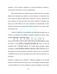 transacción. A fin de cuentas lo importante es la enorme diseminación, intercambio y outsourcing de conocimientos y de activos complementarios. Dieter termina diciendo que a medida que pasa el tiempo el foco del outsourcingse desplaza de la manufactura tipo ensamble, a servicios intensivos en conocimiento, tales como la gestión de cadena de abastecimiento, ingeniería en servicios e introducción de nuevos productos. El outsourcing puede incluir diseño y desarrollo de productos. Esto indica que las RGP difieren de las formas tradicionales de subcontratación, en tanto implican una interacción más estrecha entre el diseño, la producción y las restantes etapas de la cadena de valor. Gereffiet al (2008:6) por su parte definen cuatro dimensiones principales que son centrales en la dinámica de una industria en particular: Estructuras de entrada y salida, Geografía, Gobernanza e instituciones, veamos: Estructuras de entrada y salida. Se refiere a todo el proceso de entrada-salida que integra un producto o servicio desde su concepción inicial hasta que llega a la mano del consumidor final. El principal segmento en la típica cadena suministros implica: investigación y diseño, producción, distribución, marketing y ventas. El principal actor en cada segmento es la relativa importancia y tamaño de la cadena de valor, y la característica y estabilidad en que sus roles son examinados. Estos actores incluyen la firma líder y sus proveedores. Geografía. El segundo paso es determinar la dispersión geográfica de una actividad industrial. Las RGP tienen huella en lugares reales, ya sean pequeños o grandes en tamaño. La relativa facilidad con la cual las compañías son capaces de trasladarse a fin de obtener 44