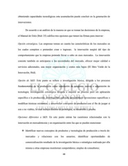 obteniendo capacidades tecnológicas esta acumulación puede concluir en la generación de innovaciones. De acuerdo a un análisis de la manera en que se toman las decisiones de la empresa, el Manual de Oslo (Ibid: 25) califica tres opciones que tienen las firmas para innovar: Opción estratégica. Las empresas toman en cuenta las características de los mercados en los cuales compiten o pretenden crear o ingresar; la innovación surgirá del tipo de comportamiento que la empresa pretende llevar a cabo en esos mercados. La innovación consiste también en anticiparse a las necesidades del mercado, ofrecer mejor calidad o servicios adicionales, una mejor organización y costos más bajos (El libro Verde de la Innovación, Ibid). Opción de I&D. Este punto se refiere a investigación básica, dirigida a los procesos fundamentales de la producción como instalación de máquinas nuevas o adquisición de tecnología; investigación estratégica dirigida a mejorar un proceso pero sin aplicación específica a la producción; investigación aplicada para producir invenciones específicas o modificar técnicas existentes; y desarrollar conceptos de productos con el fin de juzgar si son o no viables, lo cual incluye diseños de prototipos, su desarrollo y prueba. Opciones diferentes a I&D. En este punto entran las cuestiones relacionadas con la innovación en mercadotecnia y en organización entre las que se pueden mencionar: Identificar nuevos conceptos de productos y tecnologías de producción a través de: mercadeo y relaciones con los usuarios; identificar oportunidades de comercialización resultado de la investigación básica o estratégica realizada por ella misma u otras empresas monitorear competidores; empleo de consultores; 48