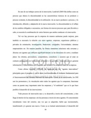 En uno de sus trabajos acerca de la innovación, Lundvall (2005:9)la define como un proceso que abarca la discontinuidad en las características técnicas de un producto o proceso existente, la discontinuidad en la utilización de un nuevo producto o proceso, y la introducción, difusión y adaptación de la nueva innovación. La discontinuidad es el reflejo de los cambios obligados o necesarios, son formas de renovar procesos qué, para llevarlos a cabo, se necesita la combinación de varios factores que unidos conducen a la innovación. Tal vez hay procesos que la empresa de manera autónoma puede mejorar, pero también es necesaria la relación con otros agentes: empresas; organismos públicos y privados de orientación, investigación, financieras; colegiados, Universidades; cámaras empresariales etc. De manera paralela, las firmas mantienen relaciones más cercanas y directas con agentes que influyen significativamente en las decisiones de corto y mediano plazo: los clientes, proveedores, competidores, consultores o asesores que al estar en contacto permanente con la dinámica del sector o la actividad, tienen acceso y/o generan información y conocimientos privilegiados que ayudan a la competitividad de la empresa. Como afirma Lundvall (2002:44) las empresas son los “agentes innovadores” principales para el progreso y, por lo tanto, son consideradas el elemento fundamental para el funcionamiento del Sistema Nacional de Innovación. Como ya se mencionaba, los SNI son los promotores y la vinculación entre todos los agentes que lo componen; funcionan como un puente muy importante entre las empresas y “el ambiente” que es lo que hace posible el desarrollo de las innovaciones. Todo proceso de innovación nace y se desarrolla a través del conocimiento, y éste llega al interior de las empresas o de las personas a través de otros agentes. El conocimiento inicialmente viene del exterior, una vez que es adquirido, habrá que incrementarlo, transformarlo y/o generar uno nuevo. Como ya se insinuó anteriormente el desarrollo del 50