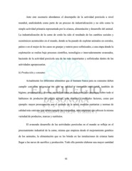 Ante este escenario abordamos el desempeño de la actividad porcícola a nivel mundial, analizándola como parte de un proceso de industrialización y no sólo como la simple actividad primaria representada por la crianza, alimentación y desarrollo del animal. La industrialización de la carne de cerdo ha sido el resultado de los cambios sociales y económicos acontecidos en el mundo, donde se ha pasado de explotar animales en corrales, patios o en el mejor de los casos en granjas y rastros poco sofisticados, a una etapa donde la explotación se realiza bajo procesos científica, tecnológica e innovadoramente avanzados, haciendo de la actividad porcícola una de las más importantes y sofisticadas dentro de las actividades agropecuarias. b) Producción y consumo Actualmente los diferentes alimentos que el humano busca para su consumo deben cumplir con altas exigencias no sólo en calidad y contenido nutricional, también de higiene, presentación y diversas especificaciones en cada porción o empaque, sobre todo si hablamos de productos de origen animal; esto obedece a múltiples factores, como por ejemplo: mayor preocupación por el cuidado de la salud, medidas sanitarias y normas de calidad más estrictas que deben cumplir las compañías, más empresas que ofrecen la misma variedad de productos, marcas y sustitutos. El avanzado desarrollo de las actividades porcícolas en el mundo se refleja en el procesamiento industrial de la carne, misma que empieza desde el mejoramiento genético de los animales, la alimentación que se les brinda en las instalaciones de crianza hasta llegar a las naves de sacrifico y producción. Todo ello permite elaborar una mayor cantidad 55