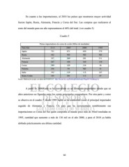 En cuanto a las importaciones, al 2010 los países que mostraron mayor actividad fueron Japón, Rusia, Alemania, Francia y Corea del Sur. Las compras que realizaron al resto del mundo para ese año representaron el 44% del total. (ver cuadro 5) Cuadro 5 Países importadores de carne de cerdo (Miles de toneladas) País/Año 2010 2005 2000 1995 Japón 751 871 650 579 Rusia 442 ND ND ND Alemania 357 360 281 311 Francia 267 188 160 130 Corea 289 259 136 36 Polonia 256 94 ND 31 Italia 192 139 115 107 Reino Unido 185 201 113 87 Fuente: Elaboración propia con datos del FAOSTAT. http://faostat.fao.org/DesktopDefault.aspx?PageID=342&lang=es A partir de 2006Rusia se ha convertido en un destacado importador siendo que en años anteriores no figuraba entre los veinte principales compradores. Por otra parte y como se observa en el cuadro 5, desde 1995 Japón se ha mantenido como el principal importador seguido de Alemania y Francia. Un país que ha incrementado notablemente sus importaciones es Corea del Sur quién compraba al mundo poco más de 36mil toneladas en 1995, cantidad que aumento a más de 136 mil en el año 2000, y para el 2010 ya había doblado prácticamente esa última cantidad. 60