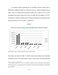 La tendencia positiva presentada por la porcicultura nacional continuó para el 2001donde la producción alcanzó un volumen de más de un millón de toneladas; para el 2002 y 2003 la actividad atraviesa pequeños baches, pero a partir de ahí se da una recuperación que permite alcanzar poco más de un millón 200 mil toneladas en el 2011, acumulando un modesto crecimiento del 13.62% para el periodo lo que representa una tasa 15 promedio anual del 1.23% (Ver cuadro 11 y gráfico 2) . Gráfico 2 Producción nacional de carne de cerdo y principales estados (Miles de toneladas) Fuente: Elaboración propia con información proporcionada por la SAGARPA en Sonora De acuerdo a los datos del cuadro 11, Puebla y Sonora fueron quienes más crecimiento acumularon con 40 y 25% respectivamente; Jalisco es el que menos crecimiento registró al 15 Para el análisis del periodo del 2001 al 2011 se excluyeron los estados de Veracruz y Michoacán, ya que su producción había venido a la baja, con una aportación menor al 5% de cada uno al total nacional. Datos obtenidos en la SAGARPHA Sonora, OEIDRUS. 72