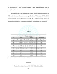 en ese momento en el único proveedor de granos y pastas para prácticamente todos los porcicultores del estado. En el periodo 1985-1989 la producción de carne de cerdo en México disminuye un 43%; en los mismo años Sonora aumenta su producción en 8.3% pasando del 7.8 a 15.1% en la participación nacional (Ver gráfico 3 y cuadro 14). Lo anterior avizoraba el futuro de la industria al fincarse en la organización e integración emprendida por los empresarios. Cuadro 14 Producción Nacional y Estatal de carne de cerdo, 1980-1990 (Miles de toneladas) Año México Sonora Participación 1980 1 250.8 125.4 10% 1981 1 306.6 129.79 10% 1982 1 365.4 136.36 10% 1983 1 485.9 149.66 10% 1984 1 455.3 156.28 10% 1985 1 293.2 101.25 8% 1986 959,3 103.81 11% 1987 914.6 108.09 12% 1988 861.2 110.342 13% 1989 726.67 109.72 15% 1990 757.35 110.191 15% Fuente: Elaboración propia con datos del INEGI, 1997. Censo Agropecuario Gráfico 3 Producción: México y Sonora 1985 – 1989 (Miles de toneladas) 84