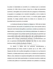 los países no desarrollados se convertiría en un obstáculo para su crecimiento económico. En 1958 el libro de Coale y Hoover fue un reflejo del pensamiento económico y demográfico de los primeros años de la posguerra en Norteamérica, se apoyaba en el paradigma de la transición demográfica y de los modelos de crecimiento económico en los cuales el ahorro y la inversión jugaban papeles esenciales. Su trabajo pretendía mostrar los efectos de un descenso en la fecundidad sobre la economía y la sociedad. La Conferencia Mundial de Población en Belgrado en 1965 trató de matizar las dos posiciones, esta reunión se caracterizó por hacer nuevos aportes sobre la interacción entre factores demográficos, económicos y sociales que abordaron los determinantes y consecuencias de las tendencias poblacionales. No obstante, en el informe final aparece como prioritario atender las altas tasas de crecimiento que obstaculizan el crecimiento económico, dejando ver, por un lado la generalidad del acuerdo entre la posición norteamericana dominante y la latinoamericana y por otro la supremacía del pensamiento anglosajón que hacia los años ochenta termina por definir la política de población en México. En México, el debate entre las posiciones neomalthusianas y latinoamericanistas fue intenso durante el periodo que va de 1965 a 1973. Después del último año la política demográfica se formaliza en la Ley General de Población y el debate pierde fuerza; escritos como La dinámica de la población en México y otros, destacaron los aspectos demográficos del crecimiento económico, aceptaron que el país había experimentado un crecimiento económico notable que no habría sido posible sin el crecimiento acelerado de la población; sin embargo,