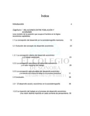 Índice Introducción 4 Capítulo I RELACIONES ENTRE POBLACIÓN Y ECONOMÍA (una revisión de la posición que ocupa el hombre en la lógica económica capitalista) I.1 La concepción del desarrollo en la sociodemografía mexicana. 12 I.2 Evolución del concepto de desarrollo económico. 23 I. 2.1 La concepción clásica del desarrollo económico y el trabajo asalariado. 23 I.2.2 La concepción neoclásica del desarrollo económico y el valor marginal del trabajo. 28 I.2.3 La concepción estructuralista del desarrollo económico y la inserción de la fuerza de trabajo en los procesos productivos. 31 I.3 Conclusión. 36 I.3.1 El desarrollo social y económico en la sociodemografía 36 1.3.2 La inserción del trabajo en el proceso de desarrollo económico. Una visión distinta implícita en cada corriente de pensamiento. 39