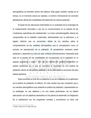 demográficas se trasmiten dentro del sistema. Este papel, también cambia en el tiempo; en el momento actual por ejemplo, el entorno internacional de creciente globalización afecta las modalidades del desarrollo de manera particular. El papel de las estructuras intermedias es un postulado de la sociología de la modernización formulado a raíz de su involucramiento en el estudio de las condiciones específicas del subdesarrollo. La nueva sociodemografía retoma los componentes de la tradición modernista, adicionándola con la estructura y el legado histórico que se encuentran detrás de los estudios sobre el comportamiento de las variables demográficas que lo conceptuaron como un proceso de reproducción de la población. El pensamiento mexicano sobre población y desarrollo se nutre de esta vertiente latinoamericana, interesada ante todo en el estudio de las modalidades de incorporación de la población en el 16 aparato económico y social. Aún así, los efectos del cambio demográfico no podían soslayarse por lo que se considera la necesidad de una política de población dentro de las políticas globales y en el corto plazo la economía del país deberá ajustarse. Estos acuerdos al nivel de la academia no se ven reflejados en la aplicación de la política de población en México. En este sentido hay que considerar que a los cambios demográficos que pretende la política de población, representados en su estrategia, en sus objetivos y en sus metas particulares, les ha faltado adecuación con los objetivos declarados en los planes de desarrollo; la integración de lo poblacional con los programas sociales y económicos no tiene una 16 Coale J. Ansley. Op. Cit. Págs. 334 y 335.