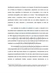 identificación sustantiva en el tiempo y en el espacio. De esta forma los programas de la Política de Población se independizan, adquiriendo una inercia con sus propios fines específicos de disminución de la fecundidad y de la tasa de 17 crecimiento demográfico como objetivo en sí mismo. Esta desintegración entre política social y económica limita la consecución de metas, de hecho, la planificación familiar si bien ha tenido éxito con una relativa integración a los programas de salud, educación y comunicación, está llegando al límite de cobertura. Los resultados de la política de población en cuanto a reducción de la fecundidad fueron satisfactorios hacia 1982 donde se cumplió con creces la meta programada, se llegó a una tasa de crecimiento poblacional de 2.4 por ciento, pero en 1990, después de transcurridos 8 años el 2.1 por ciento de incremento, implica que la reducción en el decrecimiento de la población fue de sólo tres décimas de punto porcentual, lo cual tuvo que ver con el hecho de que la disminución de la natalidad no se presentó como se había programado en esa década. En la actualidad no se conocen los elementos que influyeron en contra de la meta programática, pero es muy posible que la crisis económica que se recrudeció a partir de 1982 haya tenido efectos en la organización y financiamiento de los programas de planificación familiar. Por otro lado, está el hecho de que los grupos marginados cada vez más numerosos con baja protección en salud y deficientes servicios en planificación familiar, acusaron menores decrementos en la 17 Cabrera Gustavo, “El estado mexicano y las políticas de población”, en alba Francisco y Gustavo Cabrera (Comp.), La población en el desarrollo contemporáneo de México, El Colegio de México, México, 1era edición, 1994, Pág. 366.