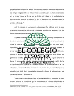 progresos de la división del trabajo con la cual aumenta la habilidad, la economía del tiempo y la posibilidad de utilización de maquinaria, pero su planteamiento cae en un círculo vicioso al afirmar que la división del trabajo es el resultado de la propensión del hombre al comercio, y que la dimensión del mercado limita la 23 división del trabajo. Así, el proceso de acumulación estudiado por los clásicos partió de dos postulados básicos: a) el principio de la población formulado por Malthus y b) la ley de los rendimientos decrecientes en la agricultura. El primer postulado apunta hacia la teoría de los salarios y el segundo a la teoría de la renta de la tierra. Ricardo señalaba que la renta de la tierra tendía a crecer a medida que se utilizaban tierras de menor calidad. Por otra parte, apoyándose en el principio de Malthus, afirmaba que la población tendería a crecer siempre que el salario obrero rebasara el nivel de la simple subsistencia. Cuando la relación tierras-población era favorable, los salarios eran altos y las ganancias elevadas. El ritmo de acumulación sería acelerado y baja la renta de la tierra. A la postre los salarios elevados significarían crecimiento rápido de la población y utilización de tierras de calidad inferior. Al aumentar el precio de los alimentos, aumentaba también el costo de la mano de obra, al propio tiempo que subía la renta de la tierra. Los salarios descendían al nivel de subsistencia y las ganancias tendían a desaparecer. Teniendo en cuenta ese modelo, Ricardo estableció dos principios de gran alcance práctico. El primero era que la elevación de los salarios comprometía la 23 Adam Smith, tomado de Furtado Celso, teoría y política del desarrollo económico, Siglo XXI, 12ª Ed., 1986. Pág. 15.