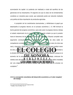 acumulación de capital, no pudiendo ser realizada a costa del sacrificio de las ganancias de los empresarios. El segundo era que la clase de los terratenientes constituía un creciente peso social, que solamente podía ser reducido mediante una política de libre importación de productos agrícolas. A propósito de los rendimientos decrecientes, y refiriéndose al papel que desempeña el progreso técnico en el proceso económico J. S. Mill formuló la teoría general del progreso económico: para este autor el progreso técnico retrasa el estado estacionario de la economía pero no puede evitarlo ya que la presión hacia el descenso de las ganancias será cada vez mayor. Ricardo completó este argumento concluyendo que la maquinaria y la mano de obra están en competencia constante; sólo se usará la maquinaria cuando la mano de obra sea cara y viceversa. Hasta aquí, el progreso técnico solo serviría para sustituir mano de obra, por eso la sutileza de Smith que atribuía el aumento de la productividad a la división del trabajo, creó dificultades insuperables para los clásicos, porque si el aumento de la productividad resultaba de la división del trabajo, entonces los 24 méritos eran del trabajo y no del capital. La acumulación de este último resultaba ser una exigencia de la misma división del trabajo, para que el proceso se 25 cumpliera. I.2.2 La concepción neoclásica del desarrollo económico y el valor marginal del trabajo. 24 Lo cual da pie para la teoría del valor trabajo de Marx. 25 Furtado, C. Op.. Cit, Pág. 16 y 17.