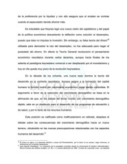 de la preferencia por la liquidez y con ello asegura que el empleo se contrae cuando el especulador decide ahorrar más. Es indudable que Keynes legó una nueva visión del capitalismo y del papel de la política económica descartando la deflación como solución al desempleo, 30 puesto que ésta no impulsa la inversión. Sin embargo, su falsa teoría del dinero utilizada para demostrar la raíz del desempleo, no fue adecuada para negar el postulado del ahorro. En efecto la Teoría General revolucionó el pensamiento económico neoclásico durante varios decenios, aunque hacia finales de los setenta el paradigma keynesiano comenzó a ser desplazado por el monetarismo y hoy en día queda muy poco de la revolución keynesiana. En la década de los ochenta, una nueva tesis domina la teoría del desarrollo en la corriente neoclásica. Aunque asigna a la formación del capital humano la función motriz del crecimiento económico, sigue siendo controlista. El argumento a favor de la reducción del crecimiento demográfico se basa en la afirmación de que, en los países del tercer mundo con crecimiento demográfico rápido, este es un obstáculo para el desarrollo de los programas de educación y de salud, y por lo tanto de los recursos humanos. Esta posición es calificada como malthusianismo en retirada, desplaza el debate sobre las consecuencias del crecimiento demográfico hacia un nuevo terreno, ubicándolo en las nuevas preocupaciones relacionadas con los aspectos 31 humanos del desarrollo. 30 El dinero es ajeno a la demanda efectiva a causa del financiamiento, por lo tanto no es escaso, luego entonces, la preferencia por la liquidez desaparece. 31 Jean-Claude Chasteland, “La croissance de la population mondiale devant la cmmunauté ef l’opinion internationales”, Revue frncaise des affaires sociales, vol. 48, n. 4, octubre-diciembre de 1994. Tomado de Lassonde Louis. Los desafíos