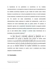 la importancia de los parámetros no económicos en los modelos macroeconómicos. La concepción se basa en la idea de que el comportamiento de las variables económicas depende en gran medida del cambio social. Dichos factores no económicos son: el tipo de propiedad de la tierra, el control extranjero de las empresas, la existencia de una parte de la población fuera de la economía, etc. De acuerdo con estas características, la escuela estructuralista latinoamericana intenta explicarse la realidad del subdesarrollo, a partir de la influencia del mundo desarrollado sobre los países pobres. Por ejemplo, el desarrollo vigoroso de la corporación trasnacional durante la posguerra planteó algunas cuestiones de economía política enteramente nuevas acerca del grado en que un país debería atraer, restringir o controlar estos transmisores de la 39 tecnología y los productos modernos. De esta manera, la estructura productiva es importante para el estructuralismo que concibe el desarrollo como proceso de cambio social tendiente a la igualación de las oportunidades sociales, pero involucrando también dicha estructura. Este es el concepto de desarrollo que retoma la sociodemografía pero que es necesario adicionar con aquellas condiciones del crecimiento económico que deben tomarse en cuenta, como lo plantearía poco tiempo después el neoestructuralismo. I.3. Conclusión. 39 Hirschman, Op. Cit. Pág. 1066.