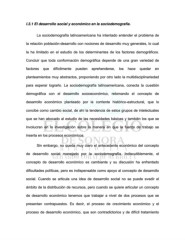 I.3.1 El desarrollo social y económico en la sociodemografía. La sociodemografía latinoamericana ha intentado entender el problema de la relación población-desarrollo con nociones de desarrollo muy generales, lo cual la ha limitado en el estudio de los determinantes de los factores demográficos. Concluir que toda conformación demográfica depende de una gran variedad de factores que difícilmente pueden aprehenderse, los hace quedar en planteamientos muy abstractos, proponiendo por otro lado la multidisciplinariedad para esperar lograrlo. La sociodemografía latinoamericana, conecta la cuestión demográfica con el desarrollo socioeconómico, retomando el concepto de desarrollo económico planteado por la corriente histórico-estructural, que lo concibe como cambio social, de ahí la tendencia de estos grupos de intelectuales que se han abocado al estudio de las necesidades básicas y también los que se involucran en la investigación sobre la manera en que la fuerza de trabajo se inserta en los procesos económicos. Sin embargo, no queda muy claro el antecedente económico del concepto de desarrollo social manejado por la sociodemografía. Indiscutiblemente, el concepto de desarrollo económico es cambiante y su discusión ha enfrentado dificultades políticas, pero es indispensable como apoyo al concepto de desarrollo social. Cuando se articula una idea de desarrollo social no se puede evadir el ámbito de la distribución de recursos, pero cuando se quiere articular un concepto de desarrollo económico tenemos que trabajar a nivel de dos procesos que se presentan contrapuestos. Es decir, el proceso de crecimiento económico y el proceso de desarrollo económico, que son contradictorios y de difícil tratamiento