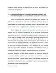 configuran culturas definidas en períodos largos de tiempo, que influyen en la 42 conformación demográfica. I.3.2 La inserción del trabajo en el proceso de desarrollo económico. Una visión distinta implícita en cada corriente de pensamiento económico. Como se mencionó antes, esencial en los estudios de la población y su relación con el desarrollo, es contar con una definición mínima de desarrollo, objetivo que en los últimos tiempos permanece olvidado o se piensa que no tiene sentido ante la realidad de la globalización que desdibuja las fronteras nacionales. Desde el ángulo de una economía nacional, el desarrollo económico se presenta como un proceso de modificación de las estructuras (principalmente aquellas que permiten la innovación tecnológica constante) y una expansión del ingreso real por unidad de trabajo. Una definición más amplia que involucre al desarrollo social, sería aquel proceso socioeconómico que contempla en su funcionamiento dos objetivos primordiales: 1) el crecimiento del producto a niveles por encima del crecimiento demográfico y 2) la distribución de dicho producto entre los grupos sociales de manera. Sin embargo, si no se tienen en cuenta los mecanismos a través de los cuales se realiza la distribución de los recursos, el término “equitativo” no tiene sentido económico. No basta con plantear la necesidad de distribuir equitativamente los beneficios del crecimiento económico, hay que decir también si eso es posible dentro de las actuales condiciones de acumulación de capital o bien cómo es posible tal cosa para que una perspectiva de desarrollo en esta dirección sea viable. 42 Ver la obra de Paúl Singer.