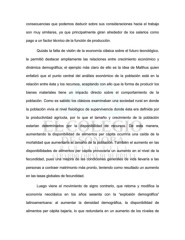 consecuencias que podemos deducir sobre sus consideraciones hacia el trabajo son muy similares, ya que principalmente giran alrededor de los salarios como pago a un factor técnico de la función de producción. Quizás la falta de visión de la economía clásica sobre el futuro tecnológico, le permitió destacar ampliamente las relaciones entre crecimiento económico y dinámica demográfica; el ejemplo más claro de ello es la idea de Malthus quien enfatizó que el punto central del análisis económico de la población está en la relación entre ésta y los recursos, aceptando con ello que la forma de producir los bienes materiales tiene un impacto directo sobre el comportamiento de la población. Como es sabido los clásicos examinaban una sociedad rural en donde la población vivía al nivel fisiológico de supervivencia donde ésta era definida por la productividad agrícola, por lo que el tamaño y crecimiento de la población estarían determinados por la disponibilidad de recursos. De esta manera, aumentando la disponibilidad de alimentos per cápita ocurriría una caída de la mortalidad que aumentaría el tamaño de la población. También el aumento en las disponibilidades de alimentos per cápita provocaría un aumento en el nivel de la fecundidad, pues una mejora de las condiciones generales de vida llevaría a las personas a contraer matrimonio más pronto, teniendo como resultado un aumento en las tasas globales de fecundidad. Luego viene el movimiento de signo contrario, que retoma y modifica la economía neoclásica en los años sesenta con la “explosión demográfica” latinoamericana: al aumentar la densidad demográfica, la disponibilidad de alimentos per cápita bajaría, lo que redundaría en un aumento de los niveles de