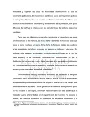 mortalidad y bajarían las tasas de fecundidad, disminuyendo la tasa de crecimiento poblacional. El marxismo en cambio se queda con la primera parte de la concepción clásica; dice que son las condiciones materiales de vida las que explican el movimiento de crecimiento y decrecimiento de la población, solo que a diferencia de Malthus lo relaciona con las características del sistema económico capitalista. Tanto para los clásicos como para los neoclásicos, el mecanismo que opera en el modelo es el del mercado, es decir, oferta y demanda de mano de obra cuyo cruce da como resultado un salario. Si la oferta de fuerza de trabajo es excedente a las necesidades del ahorro entonces los salarios se reducen y viceversa. Sin embargo, este supuesto se cuestiona, (como lo consideró Keynes en el caso del pleno empleo), si se introducen consideraciones institucionales ya que la distribución de los recursos no son datos naturales, sino que están condicionados por circunstancias históricas de posesión y propiedad de los recursos económicos, 44 es decir por las relaciones sociales de producción. En los modelos clásico y neoclásico de la teoría del desarrollo, el trabajo es considerado como un dato dentro de una relación técnica, donde el propio trabajo es responsable por el establecimiento de un precio para la fuerza de trabajo, este precio debe ser de equilibrio a fin de garantizar la existencia de la ganancia que a su vez asegura la del capital, condición necesaria para que sea posible que el trabajador vuelva a tener trabajo en el siguiente ciclo de inversión. No obstante lo anterior, los clásicos advirtieron la existencia del excedente económico y la 44 Paiva, Paulo. “Algunos comentarios sobre las relaciones entre dinámica demográfica y crecimiento económico”, en Problemas metodológicos en la investigación sociodemográfica. Varios autores- Pispal/Colmex. México, 1era. Ed. 1986. Pág. 163