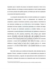 importante para el estudio del proceso de desarrollo marcando el inicio de los modelos dinámicos, sin embargo su alcance explicativo en tanto modelos basados en el mismo principio del equilibrio general, es limitado para salir de la explicación convencional del desarrollo económico. La concepción estructuralista crítica a la teoría neoclásica por no aceptar la contradicción trabajo-capital y hace un planteamiento del desarrollo que comprende y supera el crecimiento económico, porque implica el crecimiento de una estructura compleja que no se limita sólo al nivel tecnológico. Traduce la diversidad de formas sociales y económicas generadas en la división del trabajo social. El proceso de crecimiento económico es también histórico, sin cuyo componente no puede entenderse la transformación del capitalismo a través de la subordinación de otros procesos económicos. Este enfoque pone especial atención al análisis del proceso de producción, para interpretar el desarrollo económico, esto le permite analizar cómo la población se relaciona con el proceso productivo a través de su participación como fuerza de trabajo y cómo se distribuye el ingreso cuando se ubica como un agente social en el proceso 45 productivo, y no como el factor técnico a que quedaba reducido en la teoría neoclásica. Esta visión implica que el problema del desarrollo, debe abordarse bajo dos aspectos. Primero, considerar el aumento de la productividad que presupone el crecimiento del producto, y segundo, las repercusiones de dicho crecimiento en la distribución y utilización del producto en el desarrollo social, de ahí la importancia 45 ya que tiene que sobrevivir primero como agente social para que vuelva a convertirse en agente económico.