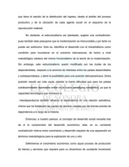 que tiene el estudio de la distribución del ingreso, desde el ámbito del proceso productivo y de la ubicación de cada agente social en el esquema de la reproducción material. No obstante, el estructuralismo así planteado, sugiere una contradicción, pues también éste presupone que la modernización es irrenunciable y por tanto no puede ser autónomo. Esto es, identifica el desarrollo con el industrialismo como condición para incursionar en el comercio internacional, de hecho a nivel metodológico adolece del mismo funcionalismo de la teoría de la modernización. Sin embargo, este estructuralismo quedó modificado por las dudas de los dependentistas, respecto a la armonía de intereses entre los países desarrollados y subdesarrollados, y abrió la posibilidad para una posición latinoamericana. Dicha posición resultó ser más cauta, planteó la fuerte dificultad que para los países subdesarrollados representa entrar en el nuevo paradigma competitivo, ya que la capacidad tecnológica que introduce la interdependencia también refuerza la dependencia en una relación asimétrica, misma que ha fortalecido las pautas de dominio creadas por las formas previas de dependencia a lo largo de la historia. Entonces, a nuestro parecer, el concepto de desarrollo social necesita tras de sí la comprensión del desarrollo económico; éste, en su constante contradicción interna entre crecimiento y desarrollo requiere de una separación en términos metodológicos para la explicación de uno y otro. Definiremos el crecimiento económico como aquel proceso de producción de bienes y servicios que requiere para su dinamismo de constante incremento