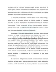tecnológico, esto es importante destacarlo porque, la mayor acumulación de capital significa potenciar el crecimiento. Lo entendemos como un proceso lineal que busca incrementar el producto económico de tal manera que se logre superar el beneficio en cada ciclo de circulación del capital. La concepción neoclásica de la economía plantea que los factores trabajo y capital, van a ser retribuidos conforme su eficiencia marginal en el proceso productivo, con ello se otorga primacía al crecimiento económico sin importar el impacto social. Por eso, normalmente se busca incentivar aquellos sectores y ramas de la producción que rindan los más altos beneficios lo cual se va a reflejar en el crecimiento del producto económico de una nación. Sin embargo el crecimiento desequilibrado en términos de tipos de actividad económica, no permite que la gran mayoría de la población tenga acceso a un ingreso económico suficiente porque precisamente aquellos procesos productivos que permiten la mayor productividad económica (y que obtienen mayores ganancias), requieren de menos fuerza de trabajo para su funcionamiento. Por otro lado, las actividades tradicionales que requieren de mayor esfuerzo físico humano que las más tecnificadas, al no ser rentables al capital, van perdiendo terreno dentro de la conformación de la estructura económica. Es el caso de los sectores primarios y principalmente de la agricultura en los países subdesarrollados. De esta manera, distinguimos el desarrollo económico del sólo crecimiento económico, al insistir que el desarrollo económico ocurre cuando la estructura económica permite la existencia de procesos productivos capaces de emplear