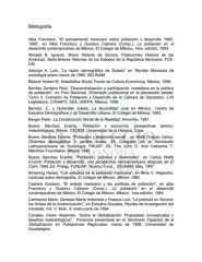 Bibliografía Alba Francisco, “El pensamiento mexicano sobre población y desarrollo 1965- 1990”, en Alba Francisco y Gustavo Cabrera (Comp.), La población en el desarrollo contemporáneo de México, El Colegio de México, 1era. edición, 1994. Almada B. Ignacio, Breve Historia de Sonora, Fideicomiso Historia de las Américas. Serie Breves Historias de los Estados de la República Mexicana. FCE. CM. Astorga A. Luis, “La razón demográfica de Estado” en Revista Mexicana de sociología enero-marzo de 1989, IIS/UNAM, Blalock Hubert M, Estadística Social, Fondo de Cultura Económica, México, 1986. Benítez Zenteno Raúl, “Descentralización y participación ciudadana en la política de población”, en Foro Nacional, Dimensión poblacional en la planeación estatal, Tomo II, Comisión de Población y Desarrollo de la Cámara de Diputados, LVII Legislatura, CONAPO, SSA, UNFPA, México, 1998. Benítez, Z., y Quilordán Julieta, La fecundidad rural en México., Centro de Estudios Demográficos y de Desarrollo Urbano, El Colegio de México, 1983. Berger Peter, La Construcción Social de la Realidad. Amorrotu, 1991 Bueno Sánchez Eramis, Población y economía, perspectivas teórico- metodológicas. Mimeo. CEDEM, Universidad de la Habana, Cuba. Bueno Sánchez Eramis, “Población y desarrollo social” , en Welti Chanes Carlos, Dinámica demográfica y cambio social, XX Congreso de la Asociación Latinoamericana de Sociología, FNUAP, IIS, The John D. And Catherine T. MacArtur Foundation, México 1996. Bueno Sánchez Eramis, “Población, pobreza y desempleo”, en Carlos Weltti (Coord) Población y desarrollo, una perspectiva latinoamericana después de El Cairo 1994.,Ed. Prolap, FUNUAP, Mcartur Fund., IISUNAM, Méx, 1997. Browning Harley, “Los estudios de la población mexicana”, en Mina V, Alejandro, Lecturas sobre demografía, El Colegio de México, México 1982. Cabrera Gustavo, “El estado mexicano y las políticas de población”, en alba Francisco y Gustavo Cabrera (Comp.), La población en el desarrollo contemporáneo de México, El Colegio de México, México, 1era edición, 1994. Camberos Mario, Genesta María Antonieta y Huesca Luis, “La pobreza en Sonora: los límites de la modernización”, en Estudios Sociales, Revista de investigación del noroeste, Vol. V, Núm. 9, enero-junio de 1994. Canales, Cerón Alejandro. “Sobre la Globalización: Propuestas conceptuales y desafíos metodológicos”, Ponencia presentada en el Seminario Impactos de la Globalización en Poblaciones Regionales, marzo de 1999. Universidad de Guadalajara.