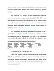 edad de la madre; en cambio para corregir el subregistro hubo que aplicar una vía indirecta a través del método de P/F de Brass. (como se explica en los siguientes párrafos) Para corregir el sub - registro, un primer procedimiento consistió en rastrear los nacimientos de principios de cada década (1950, 1960, 1970) a través de los primeros cinco años; con ello podemos confiar en que estamos captando cerca del 95 por ciento de los nacimientos que ocurrieron ese año. Al resultado de este conteo, ha dado en llamársele “nacimientos ocurridos”, porque se supone una 52 medida muy cercana a éstos. 1. El procedimiento de rastreo de registros extemporáneos se hizo de la siguiente forma: en un primer momento se rescatan los registros de los cinco primeros años de cada una de las décadas, 1950, 1960 y 1970, recogiéndose directamente de las actas confinadas en el Archivo del Registro Civil. Para ejemplificar el procedimiento me ubicaré en el año de 1950: Nacimientos Nacimientos Nacimientos Nacimientos Nacimientos ocurridos en + ocurridos en + ocurridos en + ... + ocurridos en = “ocurridos” 1950 y 1950 y 1950 y 1950 y en 1950 registrados registrados registrados registrados en ese mismo en 1951 en 1952 en 1955 año Lo mismo se hizo con el año de 1960 y 1970. Como ya se mencionó, con esta metodología obtengo casi la totalidad (95%) de los nacimientos ocurridos en cada uno de esos años, dado que el porcentaje de registros tardíos hacia la segunda mitad de la década es muy pequeño. Por supuesto, el número de “nacimientos ocurridos” todavía no es el 52 Ordorica Mellado, Manuel, Ob. Cit.