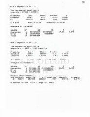 127 MTB > regress c2 on 1 cl The regression equation is inscrits = 67562 + 2255 Cl Predictor Coef Stdev t-rat io P Constant 67562 1721 39.25 0.000 Cl 2255.5 544.4 4. 14 0.003 s = 5709 R-sq • 65.6y. R-sq(adj) = 61.87. Analyeia of Variance S0URCE DF SS MS F P Regreasion 1 559578304 559578304 17.17 0.003 Error 9 293363552 32595950 Total 10 852941824 MTB > regress c3 on 1 c2 The regression equation is adscrita - - 3957 + 2.45 inscrita Predictor Coef Stdev t-rat io P Constant -3957 35833 -0. 11 0.914 inscr its 2.4547 0.5259 4.67 0.000 s « 15360 R-sq = 70.87. R-sq(adJ) • 67.57. Analysis of Variance S0URCE DF SS MS F p Regression 1 5139461120 5139461120 21.78 0.000 Error 9 2123304064 235922672 Total 10 7262765056 Unusual Observations Obs.inacrita adecrits Fit Stdev.Fit Reeidual St.Resid 6 78309 157953 188268 7307 -30315 -2.24R R denotes an obs. with a large st. resid.