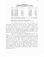 CUADRO NO.1 TRABAJADORES INSCRITOS AL IMSS EVOLUCIÓN QUINQUENAL (1955-1990) Afíü ¡sonora Cree. 7. He r mos i 11 o crec.7. 1955 27,268 6, 145 1960 55,994 105.3 11,634 89.3 1965 55,732 -0. 4 17,682 51.9 1970 77,943 39.8 25,943 46.7 1975 125,349 60.8 36,512 40.7 1980 223,990 78.7 56,437 54. 5 1985 265,359 18.4 78,309 38.7 1990 281,030 5.5 79,125 1. 1 Cree."/. 1955/1990= 1,030.67.- = 1,278.6'/. media de variación= 44.1% - - = 46. 17. Fuente:Dpto.af iliac ión/vigenc ia,IMSS, Subdelegacion Hermosillo/ Delegación Sonora. Como puede observarse para todo el estado, el crecimiento nominal más importante fue el registrado durante el primer quinquenio de funcionamiento, que es cuando se da la inscripción masiva de los trabajadores, y durante la década de 1970 a 1980 (gráfica No.1) y, aunque continuó este crecimiento en la década de los ochenta, se observó una disminución de la tendencia sostenida hasta esos años, tanto nominal como en términos porcentuales. Aunado a lo anterior, resultó significativo el hecho de que, el municipio de hermosillo, fue el que registró los crecimientos quinquenales más sostenidos hasta 1985 (cuadro No. 1 y gráfica No. 2). Si se parte del 89.37. alcanzado de 1955 a 1960, a partir de este último año se encontró entre los 38 y 55 puntos porcentuales de crecimiento quinquenal, con un máximo entre 1975 y 1380 de 54.57. y, un mínimo del 38.77. registrado durante el primer lustro de la década de los ochenta. Tendencia que se alteró en el segundo lustro cuando se registró tan sólo un 1.17., al pasar de 78,30'9 trabajadores inscritos en 1985 a 79,125 en diciembre de 1990.