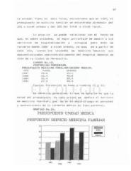 67 la unidad. Visto en esta forma, encontramos que en 1387, el presupuesto de medicina familiar se encontraba alrededor del 207. a nivel urbano y del 307. del total a nivel rural. Lo anterior se puede relacionar con el hecho de que, en ambas unidades, el mayor porcentaje se dedicó a los servicios de hospitalización y cirugía; pero esto se revierte desde 1983 a nivel urbano, ya que, es a partir de este a h i_>, cuando las unidades de medicina familiar son descentralizadas administrativamente del Hospital General de Zona de la Ciudad de Hermosillo. CUADRO No.13. PR0P0RC1UN PORCENTUAL PRESUPUESTO MEDICINA FAMILIAR/UNIDAD MEDICA. AñO RURAL URBANO 193 7 29.8 20.2 1388 32.4 46.8 1339 32.4 55.3 1930 27.3 48.3 Fuente; Estimación en base a cuadros 11 y 12. En términos generales, lo que se aprecia es que la mitad del presupuesto de cada unidad se dedica al servicio de medicina familiar, que es en su mayoría pago al personal y mantenimiento de la consulta médica de tipo personal. GRÁFICA No.10. PRESUPUESTO UNIDAD MEDICA PROPORCIÓN SERVICIO MEDICINA FAMILIAR RJUL IR3.ANA 1987 lase ioea 19"0
