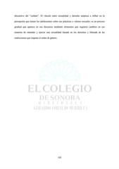 discursivo del “cuídate”. El vínculo entre sexualidad y derecho empieza a influir en la percepción que tienen los adolescentes sobre sus prácticas y valores sexuales; es un proceso gradual que aparece en sus discursos mediante elementos que sugieren cambios en sus maneras de entender y ejercer una sexualidad basada en los derechos y liberada de las restricciones que impone el orden de género. 103