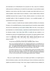 está relacionado con la obstaculización de sus proyectos de vida a causa de un embarazo, ambas posiciones se distribuyeron en la mitad de las entrevistadas. Las que decidieron esperar aludieron a varios motivos, entre ellos el miedo a los papás; nunca haber tenido novio; no se sienten decididas o tienen miedo de tener un embarazo, e incluso, también influye la falta de estabilidad emocional hacia la pareja. El miedo, elemento presente en sus discursos sobre sexualidad implica la falta de apropiación del derecho a una sexualidad protegida y el reconocimiento de su cuerpo y los placeres. Aunado a lo anterior, el modelo del amor romántico también ha influido en las relaciones de pareja y en la sexualidad femenina, en mayor proporción que la masculina, aunque también ellos han sido condicionados por estos ideales (Giddens 2000). Para ellas, el amor juega un peso importante en su relación de pareja, y representa un requisito importante para el inicio de las relaciones sexuales. Como indica Stern (2007), el modelo del amor romántico es un mecanismo de control de la sexualidad femenina, que permite a las mujeres justificar el deseo sexual. Los testimonios de Rosa, Emilia, Juan Carlos y Rogelio, nos dan elementos para afirmar lo anterior: “Es que tiene que llevar las tres cosas: amor, necesidad y placer” (Rosa) “Pues, de mi parte para poder tener sexo, cualquiera puede tener; la sexualidad para mi viene siendo una forma de querer, no para demostrar el amor, sino que ya es como para… una etapa que lleva una relación de noviazgo (Y: ¿tiene que haber noviazgo para que se dé?): pues sería lo ideal, con un poco de cariño” (Juan Carlos) “No nomás es hacerlo a lo loco y con cualquier persona, tienes que de perdida sentirlo, tiene que ser algo que tú sientes y que ella siente también, tiene que ser algo que se siente, tiene que ser algo verdadero, porque si no, nomás estás haciendo movimientos a lo loco y así no tuviera chiste, no tuviera ningún sentido hacerlo” (Rogelio) Rosa, por su parte relaciona el amor con el placer; para Emilia es un requisito para el inicio de relaciones sexuales y Juan Carlos advierte que el inicio de relaciones sexuales lleva implícito una relación de noviazgo. Como vemos, aunque el modelo del amor romántico les 108