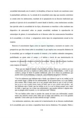 sexualidad relacionada con el control y la disciplina, al hacer un vínculo con cuestiones como la puntualidad, uniforme, etc. La mirada de la sexualidad como algo que necesita controlarse es común entre los adolescentes, resultado de la apropiación de un discurso tradicional que penaliza el ejercicio de la sexualidad El control desde la familia y otras instituciones sociales han ejercido sobre la sexualidad de los hijos, eficazmente se transfiere a ellos mediante una dispositivo de autocontrol sobre su propia sexualidad, mediante la reproducción de estereotipos de género, la racionalización en el discurso sobre las consecuencias biomédicas de la sexualidad, o al criticar y estigmatizar ciertos tipos de comportamiento sexual en las mujeres. Renovar el conocimiento figura como un aspecto importante y necesario en cuanto a las perspectivas que ellos tienen sobre la sexualidad, lo que implica una concepción dinámica de la sexualidad, que se configura de acuerdo al contexto y los cambios culturales emergentes, posibilitando un ajuste entre el campo y el habitus a través de una interiorización de esquemas de percepción alternativos sobre la sexualidad. Veamos qué dicen tanto hombres como mujeres al respecto: “Pues que nos digan la verdad, o sea siempre nos dicen, tienen que cuidarse por una enfermedad, pero en sí, muchos ni saben cuáles son las enfermedades, o todo lo que conlleva, porque te dicen te puedes embarazar, pero no te dicen los problemas que puedes tener en un embarazo, o cosas así, que realmente son graves” (Emilia) “Con los embarazos que hablaran más a fondo, que dijeran lo que es en verdad, no de que nomás llegar y hablar de las enfermedades, de las protecciones, es lo que hablan, pero nomas. Más a fondo, para ver si así, porque todas dicen ay que el traje de baño, que ya no se van a poder poner trajes de baño, que se van a poner más gordas; así, que hablaran más a fondo, que las salidas ya no va a ser la misma porque van a tener un bebé, o igual que vas a tener una enfermedad y que puedes infectar a alguien más, que se pongan entre la pared, y a ver cuál pesa más” (Marta) “No nos hablan sobre cómo te puedes dar cuenta de tener una enfermedad, cuando tienes una relación sexual cómo saber que la mujer está enferma, eso sí me gustaría aprender. Cómo saber que tú estás enfermo de algo” (Julián) Los testimonios anteriores, dan cuenta de la interiorización de un discurso medicalizado de la sexualidad, pero con miras a expandirse hacia nuevas dinámicas. Por ejemplo, Marta y 114