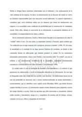 Emilia se dirigen hacia cuestiones relacionadas con el embarazo y las consecuencias en la vida cotidiana de las mujeres. Es decir, la interiorización de un discurso del miedo se vuelve un elemento imprescindible para una educación sexual tradicional. Un aspecto importante a considerar aquí, sería visibilizar cuáles son los intereses que tienen los adolescentes con respecto a su sexualidad como condición de posibilidad para la construcción de ciudadanía sexual. Entre ellos, destaca la renovación de la información, su percepción dinámica de la sexualidad y la temporalidad de las clases o talleres. En los testimonios anteriores, Emilia y Marta hacen hincapié en la importancia de saber la “verdad” sobre el sexo. En este punto, es importante retomar a Foucault, quien sostiene que “la verdad del sexo es algo esencial, útil o peligroso, precioso o temible” (1998, 35). En suma, la sexualidad es el resultado de un largo proceso histórico de occidente, en donde se han construido formas de saber-poder que intentan producir la verdad. En los testimonios presentados anteriormente, vemos como Emilia y Ana necesitan saber “la verdad”, con esto se refieren a las consecuencias biomédicas de la sexualidad, expresando formulaciones normativas y normalizadoras del saber biomédico (Amuchástegui 1998). La verdad sobre el sexo se configura de acuerdo a las expectativas y al contexto al que pertenecen los adolescentes, a través de búsquedas alternativas de información. En este tipo de búsquedas sobre una verdad del sexo acorde a sus intereses, los adolescentes hacen uso de una red perdurable de relaciones más o menos institucionalizadas de mutua familiaridad y reconocimiento, que se identifica como capital social (Bourdieu 2005), que desde diversos campos facilitan el acceso a la información cuando existen obstáculos para adquirirla a través del campo familiar o escolar. Entre las opciones que ellos mencionan se encuentran: internet (redes sociales y buscadores), amiga (o) s, compañeros de escuela, jefe de trabajo, vecinas, conserje, novia (o) s, libros y programas de televisión. 115