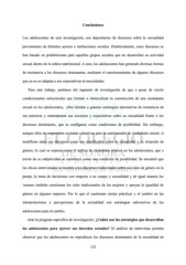 Conclusiones Los adolescentes de esta investigación, son depositarios de discursos sobre la sexualidad provenientes de distintos actores e instituciones sociales. Históricamente, estos discursos se han basado en prohibiciones para aquellos grupos sociales que no desarrollan su actividad sexual dentro de la esfera matrimonial. A esto, los adolescentes han generado diversas formas de resistencia a los discursos dominantes, mediante el cuestionamiento de algunos discursos que ya no se adaptan a sus expectativas ni necesidades. Para este trabajo, partimos del supuesto de investigación de que a pesar de existir condicionantes estructurales que limitan u obstaculizan la construcción de una ciudadanía sexual en los adolescentes, ellos tienden a generar estrategias alternativas de resistencia de sus prácticas y reinterpretan sus nociones y expectativas sobre su sexualidad frente a los discursos dominantes, que se configuran como condiciones de posibilidad. Sin embargo, aunque ellos no emprenden acciones colectivas para la construcción de ciudadanía sexual, sí modifican tanto sus discursos como sus significados sobre la sexualidad y su situación de género, lo cual se expresa como el indicio de ciudadanía relativa en los adolescentes, que a través de su subjetividad se constituye como una condición de posibilidad. Se encontró que las chicas entrevistadas se resisten a los discursos tradicionales sobre sus roles de género en la pareja, la toma de decisiones con respecto a su cuerpo y sexualidad y de igual manera los varones también cuestionan los roles tradicionales de las mujeres y apoyan la igualdad de género en algunos espacios. Por lo que el cuestionar ciertas prácticas y el cambio en las interpretaciones y percepciones de la sexualidad son estrategias subversivas de los adolescentes para el cambio. Ante la pregunta específica de investigación: ¿Cuáles son las estrategias que desarrollan los adolescentes para ejercer sus derechos sexuales? El análisis de entrevistas permite observar que los adolescentes no reproducen los discursos dominantes de la sexualidad de 123