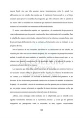 manera lineal, sino que ellos generan nuevas interpretaciones sobre lo sexual. Los adolescentes de este estudio, dan cuenta que el matrimonio heterosexual no es el único escenario para ejercer la sexualidad. Las respuestas que ellos esbozaron sobre la opinión de sus padres sobre la sexualidad son resistencias que implican la interiorización de un discurso moderno de la sexualidad con remanentes de ideas tradicionales. El acceso a una educación superior, sus expectativas y la construcción de proyectos de vida son herramientas que les permite cuestionar las ideas tradicionales de la sexualidad. Para la mitad de las mujeres entrevistadas, retrasar el inicio de las relaciones sexuales forma parte de una estrategia deliberada de evitar un embarazo, al relacionarlo como un obstáculo en sus proyectos de vida. Para el ejercicio de una sexualidad placentera en las adolescentes de este estudio, era requisito para ellas estar en una relación de pareja. En sus esquemas de percepción continúa anclado el modelo del amor romántico, al permitirles justificar su deseo sexual, que a su vez refuerza una posición conservadora de la sexualidad, ligado a la relación de pareja, la abstinencia y la pasividad de las mujeres. Las respuestas que ellas daban ante la insistencia de sus parejas por acelerar el inicio de las relaciones sexuales refleja la apropiación de las mujeres por el derecho de decidir sobre sus cuerpos y su sexualidad. Las nociones de autonomía y libertad han penetrado en los discursos de los adolescentes presentando cambios en sus formas de entender las relaciones de pareja y la sexualidad, a través de mecanismos que ellas generan para no dejarse dominar por sus parejas varones, reforzando su capacidad de tomar decisiones autónomas, en las que autoreconocen su existencia personal y refuerza la toma de decisiones. Además, estas estrategias están mediadas por la subjetividad, que se entiende como aquellas herramientas derivadas de la experiencia personal y social que les permiten reorganizar sus percepciones sobre la sexualidad. Si bien, algunos condicionantes 124