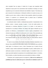sobre sexualidad. Para las mujeres, la familia fue el espacio más importante donde adquirieron la mayor parte de sus conocimientos sobre sexualidad, sin embargo, los varones respondieron que en la escuela dan información más detallada al respecto. Vale destacar que para la mayoría de los adolescentes, la información recibida en la escuela era escasa, en la medida en que las clases o talleres se daban de forma esporádica, además de que algunos referían a la repetición de la información desde la primaria hasta el bachillerato (enfermedades de transmisión sexual y embarazos). La socialización desde la familia es fundamental para permitir el mantenimiento de las prácticas, normas y creencias asociadas al género. A través del sentido práctico, las adolescentes no cuestionan diferencias de género en la familia, lo cual permite su reproducción en sus prácticas cotidianas. Sin embargo, hubo algunos indicadores que nos permiten ver diferencias y cuestionamientos al orden de género, principalmente en las relaciones de pareja que establecen las adolescentes con los varones. Ellas mencionaban que ellos no tienen autoridad para exigirles u obligarlas a hacer determinadas acciones, como el tener relaciones sexuales con ellos, tener relaciones sociales con ciertas personas o dejar de trabajar. En cuanto al acceso al placer como derecho, encontramos diferencias importantes en sus discursos. Para la mayoría de las entrevistadas, el placer no fue considerado como un derecho, estaba ligado a las relaciones de amor y afecto. Encontramos que el modelo del amor romántico, aunque continúa reproduciendo desigualdades de género, también permite a las adolescentes expresar sus emociones y sentimientos ligados a la sexualidad. Es decir, es un espacio que permite legitimar las expresiones de la sexualidad ligadas al placer y el erotismo. Para los hombres, en cambio, funcionaba como una necesidad de reivindicar su virilidad. Y finalmente, ante la pregunta general de investigación: ¿Cuáles son las condiciones de posibilidad que tienen los adolescentes para la construcción de ciudadanía sexual? Para 130