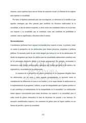 intereses, mayor apertura hacia nuevas formas de expresión sexual y la libertad de las mujeres para expresar su sexualidad. Por tanto, la hipótesis planteada para esta investigación, se reformula en la medida en que aquellas estrategias que ellos generan para modificar los discursos tradicionales de la sexualidad, se dan de manera incipiente, es decir existe una ciudadanía relativa en los jóvenes con respecto a su sexualidad, que se constituye como una condición de posibilidad al construir nuevos significados y discursos sobre la misma. Recomendaciones Consideramos pertinente hacer algunas recomendaciones respecto al tema. La primera, tomar en cuenta la perspectiva de los adolescentes para futuros proyectos, programas o políticas públicas. Es necesario partir de una visión integral que incluya la voz de los adolescentes. El diseño de programas que hacen los adultos para las sexualidades adolescentes constituye uno de los principales obstáculos debido a la brecha generacional. Por ejemplo, recomendar la abstinencia como método anticonceptivo representa una omisión por parte de los adultos a las expectativas y necesidades de los adolescentes. La ausencia de la perspectiva de género predomina en los programas dirigidos hacia los adolescentes, por tal razón y cómo segunda recomendación, es necesario tomar en consideración las diferencias en torno al ser hombre y al ser mujer durante la adolescencia en la implementación de programas y talleres, ya que las desigualdades que el género produce es lo que contribuye al mantenimiento de las desigualdades en la sexualidad. Los adolescentes tienen algunos conocimientos para tomar decisiones con respecto a su sexualidad, pero el orden social de género obstaculiza la toma de decisiones de acuerdo a sus intereses. Es necesario sensibilizarlos respecto a las cuestiones de género para así lograr cambios en sus formas de percibir y ejercer la sexualidad. 132