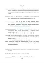 Bibliografía Adazko, Ariel. 2005. Perspectivas socio antropológicas sobre la adolescencia, la juventud y el embarazo. En Embarazo y maternidad en la adolescencia. Estereotipos, evidencias y propuestas para políticas públicas, compilado Mónica Gogna, 33-65. Buenos Aires: CEDES. Amuchástegui Herrera, Ana. 2005. Condiciones de posibilidad para el ejercicio del derecho al aborto: discursos sociales, leyes y relaciones sexuales. Desacatos (17): 77-82. ______________________. 2003. No sé decirle si quedó embarazada: género, responsabilidad y autonomía entre jóvenes mexicanos. En Varones adolescentes: género identidades y sexualidades en América Latina, compilado por José Olavarría, 143-152. Chile: Facultad Latinoamericana de Ciencias Sociales. _______________________. 1998. Virginidad e iniciación sexual en México: la sobrevivencia de saberes sexuales subyugados frente a la modernidad”. Debate feminista 9 (18): 131- 151. Amuchástegui herrera, Ana y Martha Rivas Zivy. 2004. Los procesos de apropiación subjetiva de los derechos sexuales: notas para la discusión. Estudios demográficos y urbanos (57): 543-597. Bobbio, Norberto.1964. La ilusión del fundamento absoluto. La base de los derechos humanos. Coloquio del Instituto Internacional de Filosofía en L´Aquila 14-19 septiembre 1964. Florencia. Bourdieu Pierrre y Wacquant Loïc. 2005. Una invitación a la sociología reflexiva. Argentina: Siglo XXI. Bourdieu, Pierre. 2007. El sentido práctico. Argentina: Siglo XXI. ______________.2002. Campo de poder, Campo intelectual. Argentina: Montresor. 135