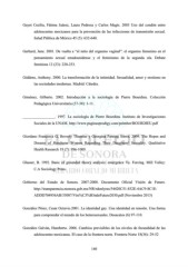 Gayet Cecilia, Fátima Juárez, Laura Pedrosa y Carlos Magis. 2003 Uso del condón entre adolescentes mexicanos para la prevención de las infecciones de transmisión sexual. Salud Pública de México 45 (5): 632-640. Gerhard, Jane. 2001. De vuelta a “el mito del orgasmo vaginal”: el orgasmo femenino en el pensamiento sexual estadounidense y el feminismo de la segunda ola. Debate feminista 12 (23): 220-253. Giddens, Anthony. 2000. La transformación de la intimidad. Sexualidad, amor y erotismo en las sociedades modernas. Madrid: Cátedra. Giménez, Gilberto. 2002. Introducción a la sociología de Pierre Bourdieu. Colección Pedagógica Universitaria (37-38): 1-11. _________________. 1997. La sociología de Pierre Bourdieu. Instituto de Investigaciones Sociales de la UNAM. http://www.paginasprodigy.com/peimber/BOURDIEU.pdf Giordano Francesca G, Beverly Thumme y Georgina Panting Sierra. 2009. The Hopes and Dreams of Honduran Women Regarding Their Daughters' Sexuality. Qualitative Health Research 19 (7): 996-1009. Glasser, B. 1992. Basic of grounded theory analysis: emergence Vs. Forcing. Mill Valley: C.A Sociology Press. Gobierno del Estado de Sonora. 2007-2008. Documento Oficial Visión de Futuro. http://transparencia.esonora.gob.mx/NR/rdonlyres/54420C51-832E-4AC9-8C1E- ADDD704956AB/35087/Visi%C3%B3ndeFuturo2030.pdf (Noviembre 2013) González Pérez, Cesar Octavio.2001. La identidad gay. Una identidad en tensión. Una forma para comprender el mundo de los heterosexuales. Desacatos (6) 97-110. González Galván, Humberto. 2006. Cambios previsibles de los niveles de fecundidad de las adolescentes mexicanas. El caso de la frontera norte. Frontera Norte 18(36): 29-52 140
