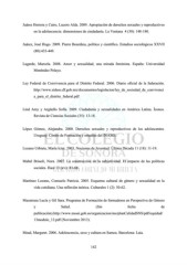Juárez Herrera y Cairo, Lucero Aída. 2009. Apropiación de derechos sexuales y reproductivos en la adolescencia: dimensiones de ciudadanía. La Ventana 4 (30): 148-180. Juárez, José Hugo. 2009. Pierre Bourdieu, político y científico. Estudios sociológicos XXVII (80):433-449. Lagarde, Marcela. 2008. Amor y sexualidad, una mirada feminista. España: Universidad Menéndez Pelayo. Ley Federal de Convivencia para el Distrito Federal. 2006. Diario oficial de la federación. http://www.sideso.df.gob.mx/documentos/legislacion/ley_de_sociedad_de_convivenci a_para_el_distrito_federal.pdf Lind Amy y Argüello Sofía. 2009. Ciudadanía y sexualidades en América Latina. Íconos. Revista de Ciencias Sociales (35): 13-18. López Gómez, Alejandra. 2000. Derechos sexuales y reproductivos de los adolescentes. Uruguay: Centro de Formación y estudios del INAME. Lozano Urbieta, María Iciar. 2003. Nociones de Juventud. Última Década 11 (18): 11-19. Mabel Briuoli, Nora. 2007. La construcción de la subjetividad. El impacto de las políticas sociales. Haol 13 (s/v): 81-88. Martínez Lozano, Consuelo Patricia. 2005. Esquema cultural de género y sexualidad en la vida cotidiana. Una reflexión teórica. Culturales 1 (2): 30-62. Mazarrasa Lucía y Gil Sara. Programa de Formación de formadores en Perspectiva de Género y Salud. (Sin fecha de publicación).http://www.msssi.gob.es/organizacion/sns/planCalidadSNS/pdf/equidad/ 13modulo_12.pdf (Noviembre 2013). Mead, Margaret. 2006. Adolescencia, sexo y cultura en Samoa. Barcelona: Laia. 142