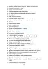 25. ¿Perteneces a un grupo artístico, religioso, etc., dentro o fuera de la escuela? 26. ¿Qué papel desempeñas en ese grupo? 27. ¿Qué tipo de actividades realizan? 28. ¿Tus amigos pertenecen a alguno de esos grupos? 29. ¿En alguno de esos grupos les han hablado sobre derechos humanos? 30. ¿Qué les dicen? 31. ¿Sabes cuáles son tus derechos? 32. ¿Dónde has aprendido más sobre esto? 33. ¿Consideras que en tu casa tus papas o hermanos limitan tus derechos? 34. ¿Por qué? 35. ¿Tienes o has tenido novio(a)? 36. ¿Cómo te llevas con ell@? 37. ¿Tienen ideas diferentes? 38. ¿Eso hace que tengan problemas en la relación? 39. ¿Cómo qué? 40. ¿Sobre qué temas platican? 41. ¿Tus papas qué te dicen de tu relación? 42. ¿Hablas de sexualidad con tus papas? 43. ¿Quién de los dos te habla más de sexualidad? 44. ¿Por qué crees que te habla más tu mamá o tu papá? 45. ¿Te acercas a ellos para pedirles consejos de sexualidad? 46. ¿Qué tipo de consejos te dan? 47. ¿Han llegado a tener conflictos cuando se toca el tema? 48. ¿Qué piensas de lo que opinan tus papas? 49. ¿Sigues sus consejos? 50. ¿Alguna vez has hablado sobre sexualidad con tu novia? 51. ¿Recuerdas alguna experiencia divertida que hayas tenido sobre el tema con ell@? 52. ¿Alguna experiencia difícil que te haya causado problemas con tu novi@? 53. ¿Cómo hiciste para solucionarlo? 54. ¿Alguna vez en la preparatoria tuviste clases de sexualidad? 55. ¿Qué temas se tocaban en clase? 56. ¿Aunque no hayas tenido clases de sexualidad, hablan los maestros o prefectos sobre el tema? 57. ¿Han llevado algún taller sobre sexualidad? 152