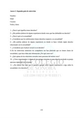 Anexo 2. Segunda guía de entrevista Nombre: Edad: Cecytes: Fecha y hora: 1.- ¿Para ti qué significa tener derechos? 2.- ¿Me podrías platicar de alguna experiencia donde crees que has defendido un derecho? 3.- ¿Para ti qué es la sexualidad? 5.- ¿Consideras que los adolescentes tienen derechos respecto a su sexualidad? 6.- ¿Me podrías platicar de alguna experiencia en donde se haya violado algún derecho relacionado con la sexualidad? 7.- ¿Consideras que el placer sexual es un derecho? 8.-En las entrevistas anteriores tus compañeros me han platicado que no tienen clases de sexualidad y que hace falta más información ¿Por qué crees eso? 9.- ¿Qué opinas de las relaciones sexuales entre personas del mismo sexo? 10.- ¿Cómo reaccionarías si alguna de tus amigas estuviera en una relación en donde su pareja ejerciera algún tipo de violencia? 11.- ¿Por último hay algo que te gustaría agregar sobre alguna experiencia o algo sobre la sexualidad y los derechos? 155