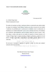 Anexo 3. Carta autorización entrada a campo 13 de marzo de 2013 Lic. Alfredo Ortega López Director de planeación Cecytes Por medio de la presente me dirijo a usted para solicitar su autorización para realizar trabajo de campo de la estudiante Yanelli Barojas Armenta, que realiza el proyecto de tesis titulado “condiciones de posibilidad para la construcción de ciudadanía sexual en adolescentes de bachillerato en la ciudad de Hermosillo”; para el cual se realizarán entrevistas a 20 estudiantes de la institución, aproximadamente cuatro por plantel, durante los meses de marzo y abril. Este trabajo se realiza como parte de sus estudios de maestría en Ciencias Sociales en El Colegio de Sonora. Para los contactos iniciales se hablará con directivos y profesores de cada plantel, asimismo se gestionará la aceptación de los estudiantes para la realización de las entrevistas. Sin más para el momento, le agradezco la atención y ayuda. Los datos para cualquier aclaración están al pie de la letra. Dra. María del Carmen Castro Vázquez Directora de tesis Ccastro@colson.edu.mx 156